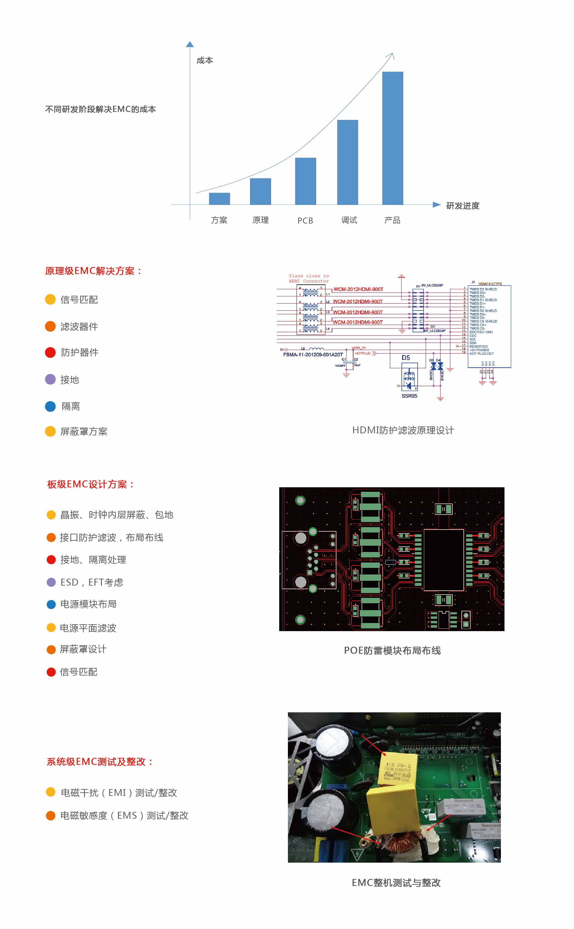在设计阶段考虑EMC问题,不仅付出的成本较低,还能减少产品的验证次数,缩短研发周期。汉普可以提供从原理设计、PCB设计端的EMC设计建议与方案,还可以针对后期调试,进行系统级的EMC测试、定位、整改工作。